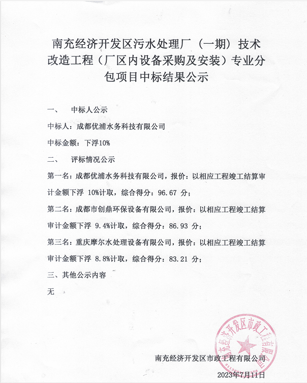 關(guān)于南充經(jīng)濟開發(fā)區(qū)污水處理廠(一期)技術(shù)改造工程(廠區(qū)內(nèi)設(shè)備采購及安裝)專業(yè)分包項目