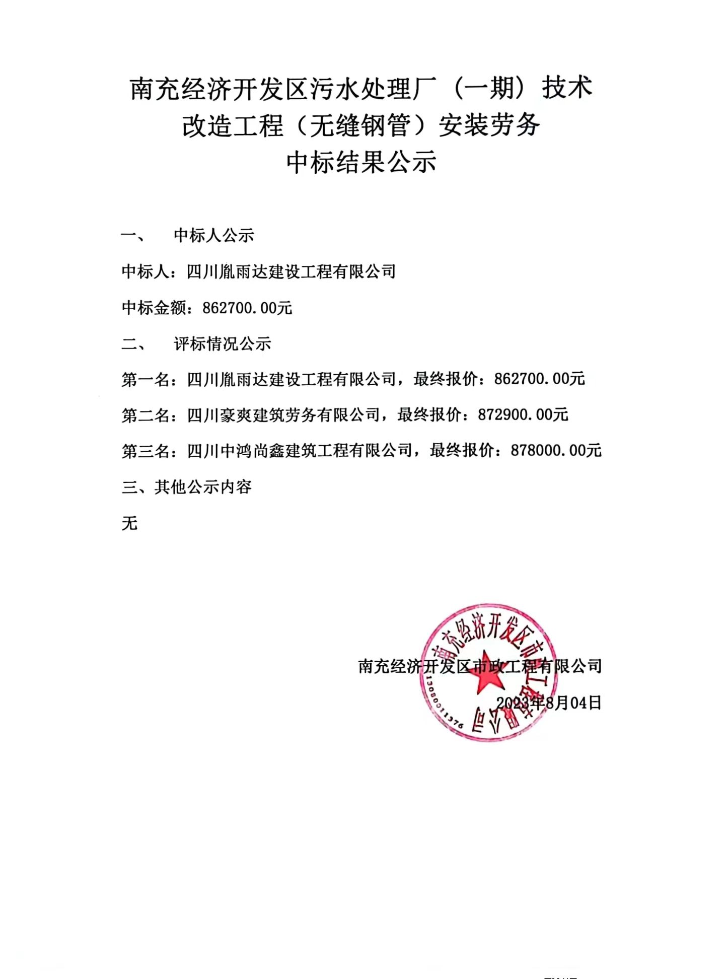 南充經(jīng)濟開發(fā)區(qū)污水處理廠(一期)技術(shù)改造工程(無縫鋼管)安裝勞務(wù)中標(biāo)結(jié)果公示